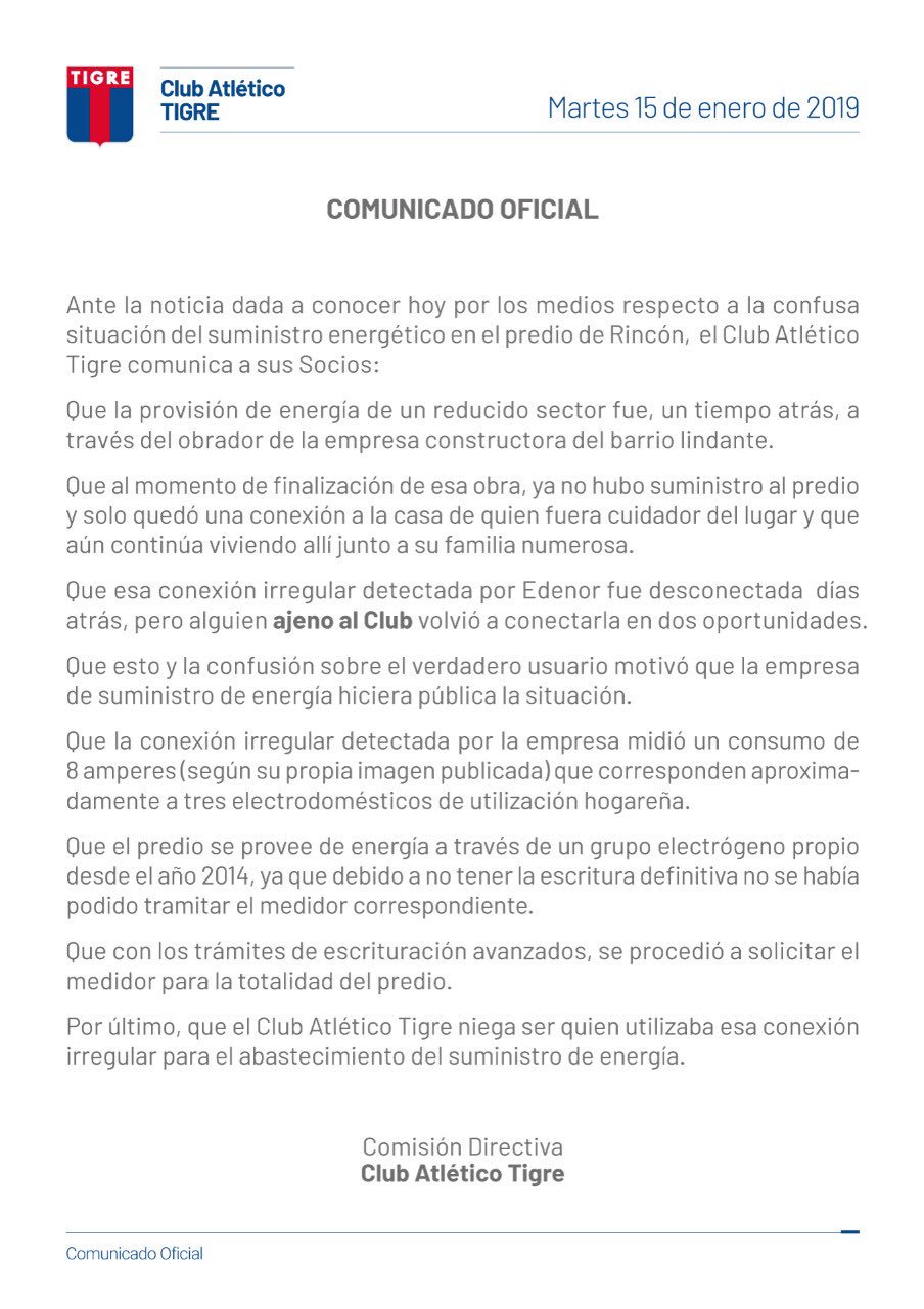 Comunicado del Club Tigre por la Denuncia de Edenor